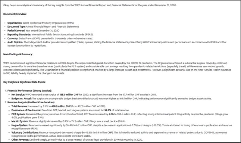 | Concise Interpretation | Included extensive analysis of the financial hardening and challenges of WIPO. | The main points were articulated clearly and summarised well. |